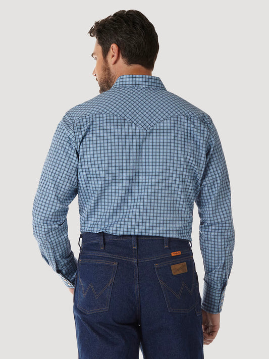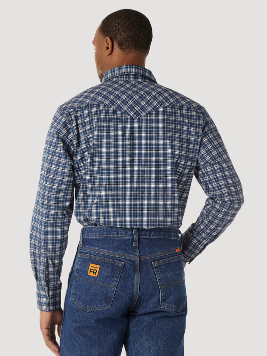 MEN'S WRANGLER® FR FLAME RESISTANT LONG SLEEVE WESTERN SNAP PLAID SHIRT IN BLUE/BLACK