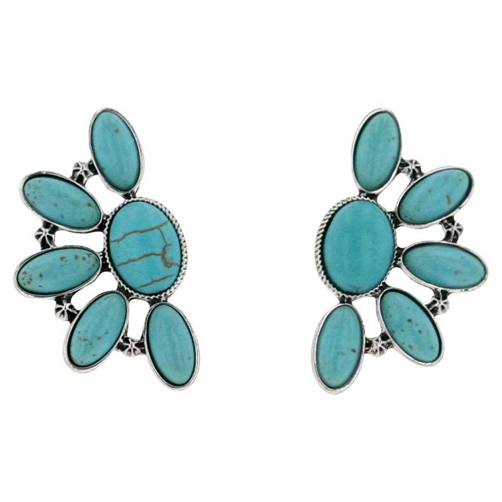 Vivid turquoise stones make up the Turquoise Trinket Attitude Earrings. Shaped like half of a sun or flower the teardrop shaped stones fan out from a round middle stone. These stones are held in place by silver tone borders and the earrings also feature small metal flowers in between the teardrop shapes adding additional detail. The silver tone is antiqued to bring contrast to the earrings. These earrings are held in place by hypoallergenic posts.?
